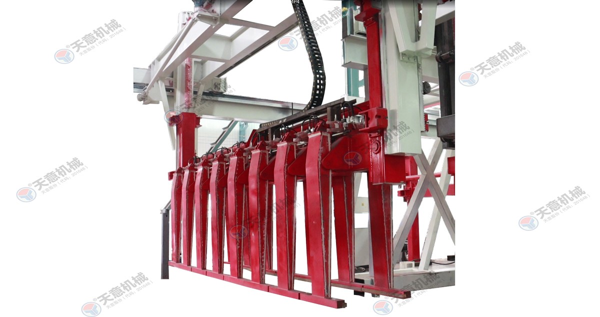 成品分垛吊機:將蒸養車上的一模坯體吊運至掰板輸送機上,然后將空側板吊運至蒸養車上;切割工段空翻脫模機將模框翻轉90°,放在切割小車支座上進行脫模,脫模后的??蚺c清理后的側模板進行合模,合膜后的空??虮坏?..