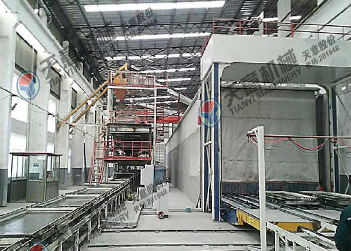 多功能墻板生產線,可生產“三明治”夾芯板,鋼邊框屋面板、樓面板,不帶面板復合板。生產線主要分為自動配料系統、攪拌系統、發泡系統、中央控制配電系統、輕質混凝土布料系統、磨光系統、模具循環系統、養護系統、碼垛系統等部分組成。