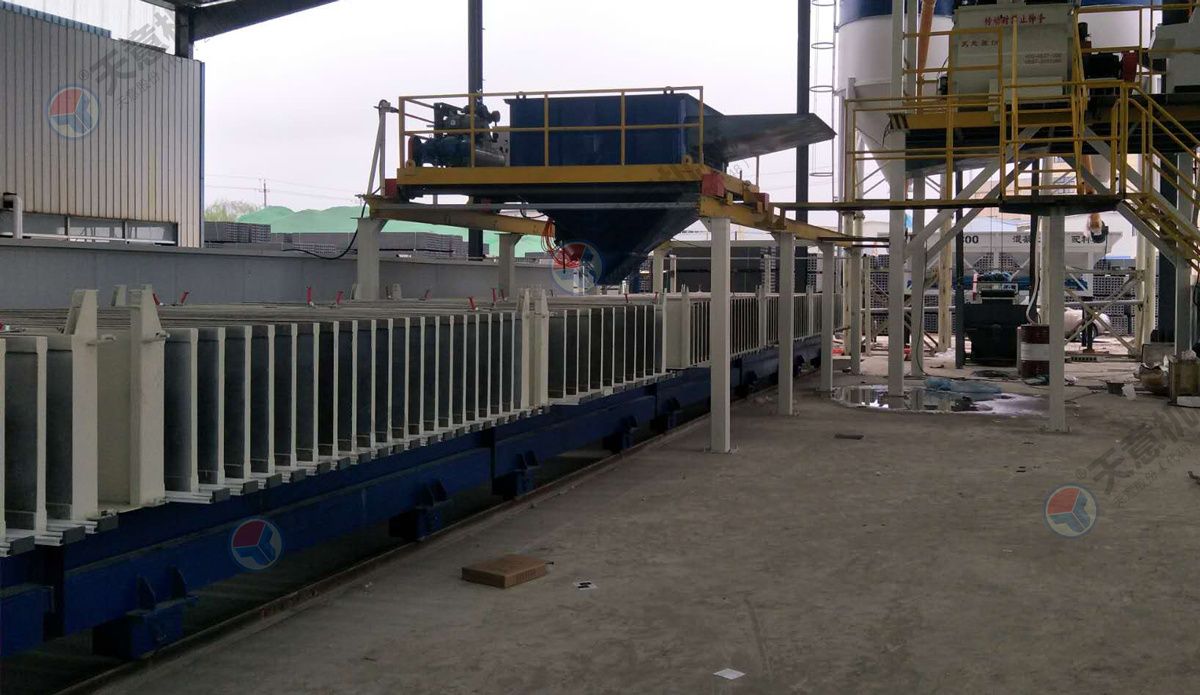 TY20型輕質墻板生產線包括:墻板成型機、整體穿抽管系統、發泡系統、水箱、電子計量儲料倉、螺旋上料輸送機、儲料罐、螺旋輸送機、EPS熟化料倉、硫化干燥床、EPS預發機、數控配電室、發泡攪拌機、整體出板系統、叉車、成品堆放區、擺渡車。